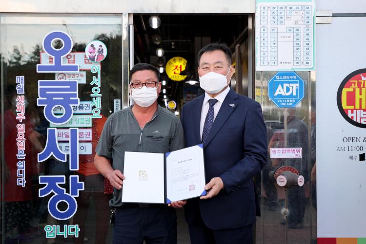 ¹Úº¹ÀÏ ¿À·æ½ÃÀå »óÀÎȸÀåÀº ¡°Á¦1È£ °ñ¸ñÇü»óÁ¡°¡ ÁöÁ¤À» ±â³äÇØ ¿ù 3ȸ, 3¸¸¿ø ÀÌ»ó ¿À·æ½ÃÀåÀ» ÀÌ¿ëÇϽŠµÚ ¿µ¼öÁõÀ» Á¦½ÃÇÏ¸é ¹«¾È»ç¶û»óǰ±Ç 5õ¿øÀ» ÁõÁ¤ÇÏ´Â À̺¥Æ®¸¦ ÁøÇàÇϰí ÀÖ´Ù¡±¸ç¡°¹«¾È±º°ú ÇÔ²² ¹æ¹®ÇÏ°í ½ÍÀº ¿À·æ½ÃÀå °ñ¸ñÇü»óÁ¡°¡¸¦ ¸¸µé±â À§ÇØ ÃÖ¼±À» ´ÙÇϰڴ١±°í ¸»Çß´Ù.
