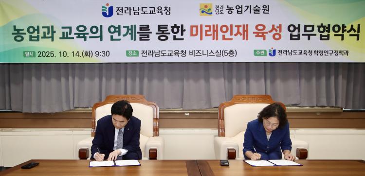 Àü¶ó³²µµ±³À°Ã»(±³À°°¨ ±è´ëÁß)Àº 10¿ù 14ÀÏ Ã»»ç 5Ãþ ºñÁö´Ï½º½Ç¿¡¼ Àü¶ó³²µµ ³ó¾÷±â¼ú¿ø(¿øÀå ±èÇà¶õ)°ú ¡®³ó¾÷°ú ±³À°ÀÇ ¿¬°è¸¦ ÅëÇÑ ¹Ì·¡ÀÎÀç À°¼º ¾÷¹«Çù¾à¡¯À» ü°áÇß´Ù.