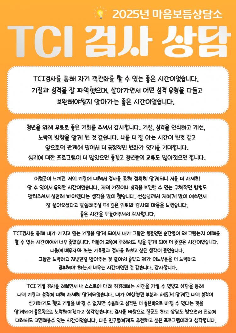 TCI »ó´ã¿¡ Âü¿©ÇÑ ÇÑ Ã»³âÀº ¡°°Ë»ç¸¦ ÅëÇØ ³ª¸¦ °´°üÀûÀ¸·Î ¹Ù¶óº¼ ¼ö ÀÖ¾ú°í, ±âÁúÀº Ÿ°í³ªÁö¸¸ ¼º°ÝÀº º¯ÈÇÒ ¼ö ÀÖ´Ù´Â Á¡À» »õ·Ó°Ô ±ú´Þ¾Ò´Ù¡±¸ç ¡°»ó´ãÀ» °è±â·Î Áø·Î¿Í »îÀÇ ¹æÇâÀ» ´Ù½Ã »ý°¢ÇÏ°Ô µÆ´Ù¡±°í ¸»Çß´Ù.