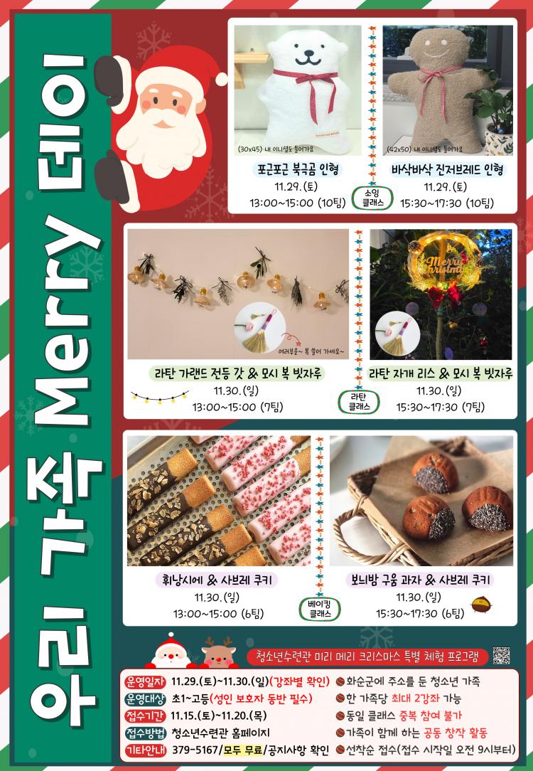 ȼø±º(±º¼ö ±¸º¹±Ô)û¼Ò³â¼ö·Ã°üÀº ¿¬¸»À» ¸Â¾Æ °¡Á·ÀÌ ÇÔ²² Âü¿©ÇÒ ¼ö ÀÖ´Â ¡®¹Ì¸® ¸Þ¸® Å©¸®½º¸¶½º Ưº° üÇè ÇÁ·Î±×·¥¡¯À» ¿À´Â 11¿ù 29ÀϺÎÅÍ 11¿ù30ÀϱîÁö ¿î¿µÇÑ´Ù°í ¹àÇû´Ù.