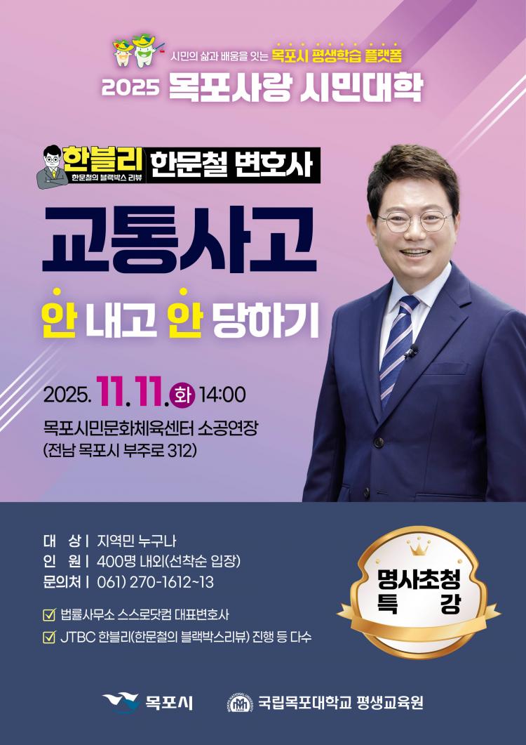 À̹ø °¿¬Àº ¸ñÆ÷½Ã¿Í ±¹¸³¸ñÆ÷´ëÇб³°¡ °øµ¿ ¿î¿µÇÏ´Â ¡¸¸ñÆ÷»ç¶û ½Ã¹Î´ëÇС¹ °ÁÂÀÇ ÀÏȯÀ¸·Î ¸¶·ÃµÆ´Ù. JTBC ¡®ÇÑºí¸®(Çѹ®Ã¶ÀÇ ºí·¢¹Ú½º ¸®ºä)¡¯·Î Àß ¾Ë·ÁÁø Çѹ®Ã¶ º¯È£»ç´Â ±³Åë»ç°í ó¸® ºÐ¾ßÀÇ ´ëÇ¥ÀûÀÎ Àü¹®°¡·Î, ½ÇÁ¦ »ç°í ¿µ»ó°ú ÆÇ·Ê¸¦ ÅëÇØ ¹ýÀû Ã¥ÀÓ ºñÀ², »ç°í ´ëó ¿ä·É µî Àϻ󿡼 µµ¿òÀÌ µÇ´Â ±³Åë¹ý·ü Á¤º¸¸¦ ¾Ë±â ½±°Ô ÀüÇÒ ¿¹Á¤ÀÌ´Ù.