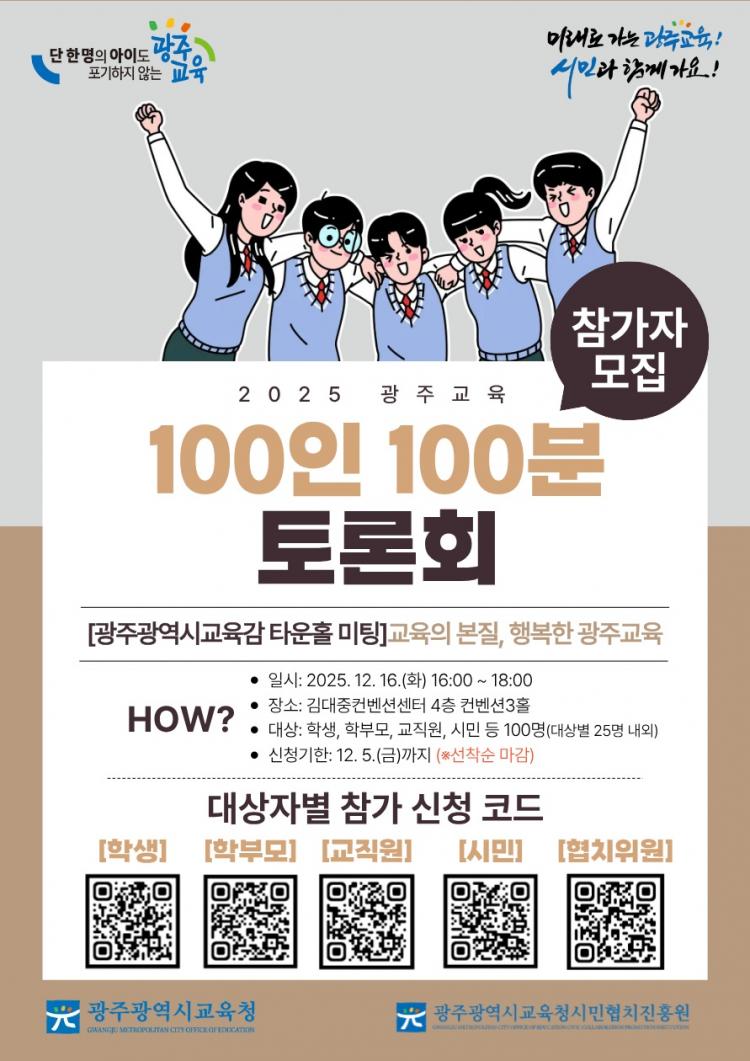 ±¤Áֽñ³À°Ã»½Ã¹ÎÇùÄ¡ÁøÈï¿ø(ÀÌÇÏ ½Ã¹ÎÇùÄ¡ÁøÈï¿ø)Àº ¿À´Â 12¿ù 16ÀÏ ±è´ëÁßÄÁº¥¼Ç¼¾ÅÍ 4Ãþ ÄÁº¥¼ÇȦ¿¡¼ ¡®2025 ±¤ÁÖ±³À° 100ÀÎ 100ºÐ Åä·Ðȸ¡¯¸¦ °³ÃÖÇÑ´Ù.