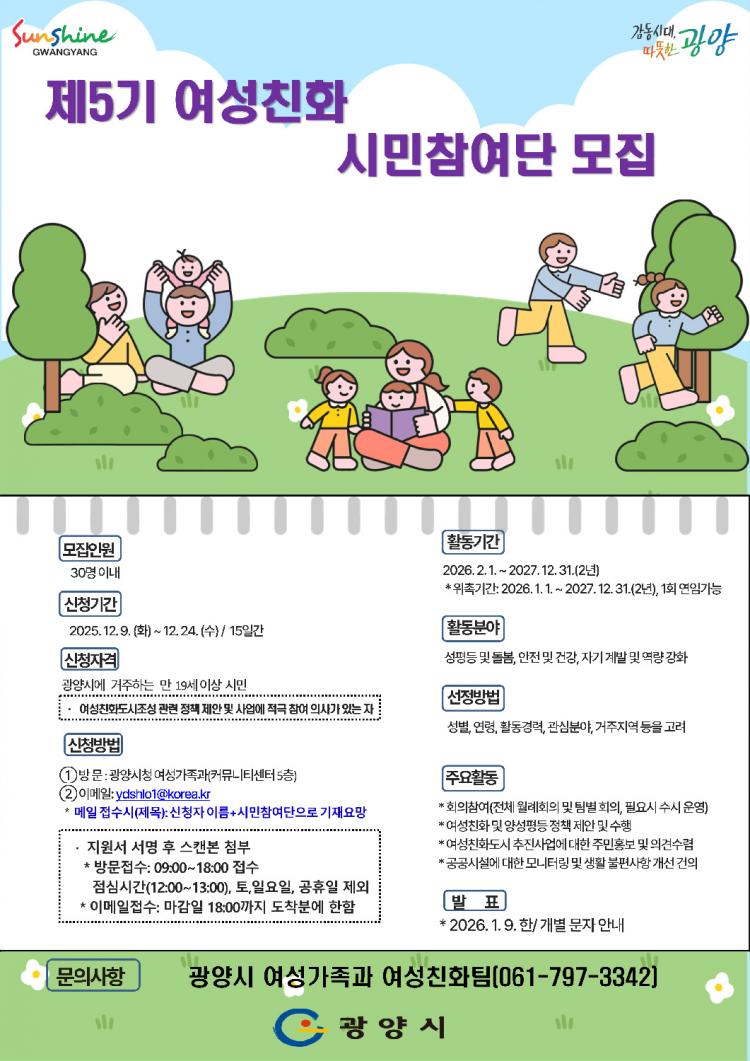 ±¤¾ç½Ã´Â ¿©¼ºÄ£Èµµ½Ã Á¶¼º¿¡ ½Ã¹ÎÀÇ ¸ñ¼Ò¸®¸¦ Àû±Ø ¹Ý¿µÇϱâ À§ÇØ Á¦5±â ¿©¼º Ä£È ½Ã¹ÎÂü¿©´ÜÀ» ¸ðÁýÇÑ´Ù°í ¹àÇû´Ù.