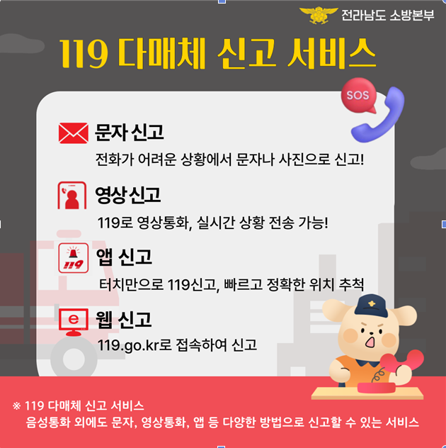 ¹®ÀÚ´Â 119 ¹øÈ£·Î »ç°í³»¿ë µîÀ» ÀÔ·ÂÇÏ¸é ½Å°í°¡ Á¢¼öµÇ°í »çÁø°ú µ¿¿µ»ó ¶ÇÇÑ Ã·ºÎ°¡ °¡´ÉÇÏ´Ù. ¿µ»óÅëÈ ¼ºñ½º´Â 119 ¹øÈ£¸¦ ´©¸£°í ¿µ»óÅëÈ ¹öưÀ» ´©¸£¸é 119»óȲ½Ç·Î ¿¬°áµÇ¾î »ç°í ÇöÀå°ú »óȲÀ» ´õ¿í °£´ÜÇÏ°Ô ¼³¸íÇÒ ¼ö ÀÖ´Ù.