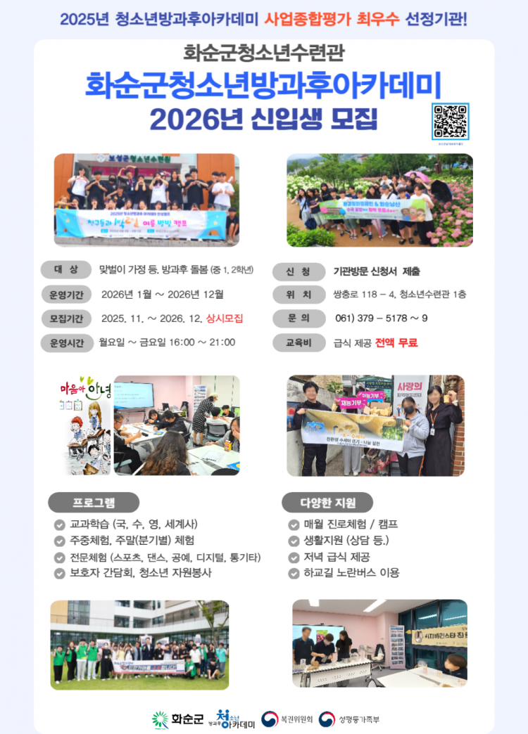 2026³â ¹æ°úÈľÆÄ«µ¥¹Ì¿¡ Âü¿©Çϴ û¼Ò³âµéÀº ¡ã±¹¾î¡¤¼öÇС¤¿µ¾î µî ÇнÀ Áö¿ø ¡ã½ºÆ÷Ã÷, °ø¿¹, ³Å¸ ¹®È ¿¹¼ú üÇè ¡ãÁø·Î üÇè, ÁÖ¸» üÇè, Ä·ÇÁ ¡ã½É¸® »ó´ã ¹× Á¤¼ Áö¿ø ¡ã¼®½Ä Á¦°ø ¹× ¾ÈÀüÇÑ ±Í°¡ Â÷·® Áö¿ø µî ´Ù¾çÇÑ ¹æ°ú ÈÄ Á¾ÇÕ ¼ºñ½º¸¦ ¹«·á·Î ÀÌ¿ëÇÑ´Ù. ´Ù¸¸, ±³Àç ¹× ÀϺΠÀç·áºñ´Â °³ÀÎ ºÎ´ãÀÌ´Ù.