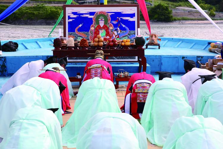 -dz¾î¿Í ¾È³çÀ» ±â¿øÇÏ´Â ½Å¼ºÇÑ ÀÇ½Ä ¹ý¼ºÆ÷´Ü¿ÀÁ¦ÀÇ ÇÙ½ÉÀº ½Å°ú Àΰ£ÀÌ ÇÔ²² ¾î¿ì·¯Áö´Â ´Ùä·Î¿î Á¦ÀÇ¿¡ ÀÖ´Ù. ÃàÁ¦ ±â°£¿¡´Â ÃÑ ³× °¡ÁöÀÇ Á᫐ ÀǽÄÀÌ °ÅÇàµÇ´Âµ¥, ¹ý¼ºÆ÷ÀÇ Áø»êÀÎ ÀÎÀǻ꿡¼ ¸¶À»ÀÇ ¼öÈ£½Å¿¡°Ô ¾È³çÀ» °íÇÏ´Â '»ê½ÅÁ¦(ÀÎÀÇÁ¦)', ÇҾƹöÁö´ç»ê°ú ÇÒ¸Ó´Ï´ç»ê¿¡¼ ¸¶À»ÀÇ ÈÇÕ°ú dz¾î¸¦ ºñ´Â '´ç»êÁ¦', Çѽº·¯¿î ¿µÈ¥À» À§·ÎÇÏ´Â '¹«¼Ó¼ö·úÀç', ±×¸®°í ´Ü¿ÀÁ¦ÀÇ °¡Àå µ¶Æ¯Çϰí Áß½ÉÀûÀÎ Á¦ÀÇÀÎ '¿ë¿ÕÁ¦'°¡ ±×°ÍÀÌ´Ù. ƯÈ÷ ¿ë¿ÕÁ¦´Â dz¾î¿Í Á¶¾÷ÀÇ ¾ÈÀüÀ» ±â¿øÇϱâ À§ÇØ ¹è¸¦ Ÿ°í Ä¥»ê¹Ù´Ù·Î ³ª°¡ ¼±»ó¿¡¼ ÆîÃÄÁø´Ù. Á¦°ü°ú ¹«´ç ÀÏÇàÀÌ ¸ÕÀú ¿ë¿ÕÀÇ ÅÊȸ¦ °É°í À¯±³½ÄÀ¸·Î Á¦»ç¸¦ ¿Ã¸®¸ç Ã๮À» ÀÐÀ¸¸é, µÚÀÌ¾î ¹«³à¿Í ¾Ç»çµéÀÌ º»°ÝÀûÀ¸·Î ¿ë¿Õ±ÂÀ» ¿¬ÇàÇÏ¸ç ºÐÀ§±â¸¦ °íÁ¶½ÃŲ´Ù. ±ÂÀÇ ¸¶Áö¸·¿¡´Â ¼è¸Ó¸®¸¦ ¹Ù´Ù¿¡ ´øÁö¸ç dz¾î¿Í ¹«Å»À» ±â¿øÇϴµ¥, ÀÌó·³ À¯±³½Ä Á¦»ç¿Í ¹«¼Ó ½Å¾ÓÀÌ °áÇÕµÈ µ¶Æ¯ÇÑ ±¸Á¶´Â ¹ý¼ºÆ÷´Ü¿ÀÁ¦¸¸ÀÇ °íÀ¯ÇÑ Æ¯Â¡ÀÌ´Ù. ¿ë¿ÕÁ¦°¡ ³¡³ª¸é °ð¹Ù·Î ¹ý¼ºÆ÷ÀÇ °íÀ¯ ¹Î¼Ó³îÀÌÀÎ '¼±À¯³îÀÌ'°¡ À̾îÁø´Ù. ÇѺ¹À» °ö°Ô Â÷·ÁÀÔÀº ºÎ³àÀÚµéÀÌ ³ª·í¹è¿¡ ¿Ã¶ó ÁÖº¯ °æÄ¡¸¦ °¨»óÇϸç À屸Àå´Ü¿¡ ¸ÂÃç Ãã°ú ³ë·¡·Î ÇѲ¯ dz·ù¸¦ Áñ±â´Â ¸ð½ÀÀº ÇÑ ÆøÀÇ ±×¸²°ú °°´Ù. ÀÌ ¿Ü¿¡µµ ´Ü¿ÀÀÇ ´ëÇ¥ ¹Î¼Ó³îÀÌÀÎ ¾¾¸§°ú ±×³×¶Ù±â°¡ ÆîÃÄÁö°í, âÆ÷¹°¿¡ ¸Ó¸®¸¦ °¨À¸¸ç ¾×¿îÀ» ÂѴ üÇè, ¾¦¶± ¸ÞÄ¡±â µî ´Ù¾çÇÑ Çà»ç°¡ ¸¶·ÃµÇ¾î ÃàÁ¦ÀÇ ÈïÀ» ´õÇÑ´Ù. ¶ÇÇÑ, ¿¹·ÎºÎÅÍ ±× ±ÇÀ§¸¦ ÀÎÁ¤¹Þ¾Æ ¿Â '½£ÀïÀÌÀü±¹±¹¾Ç°æ¿¬´ëȸ'´Â Àü±¹ÀÇ ¸íÀÎ ¸íâµéÀÌ ±â·®À» °Ü·ç´Â ¿¹¼úÀÇ ÀåÀ¸·Î¼ ¹ý¼ºÆ÷´Ü¿ÀÁ¦ÀÇ °ÝÀ» ÇÑÃþ ³ôÀ̰í ÀÖ´Ù.