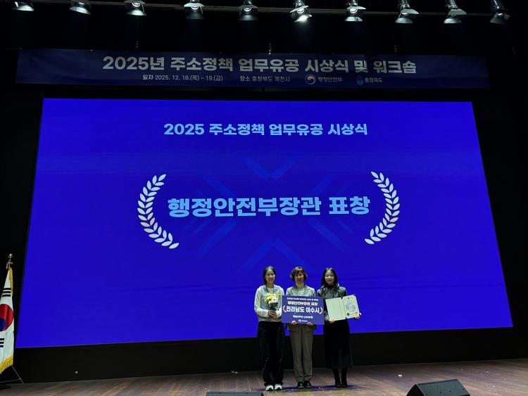 ¿©¼ö½Ã´Â ÇàÁ¤¾ÈÀüºÎ°¡ ÁÖ°üÇÏ´Â ¡®2025³â ÁÖ¼ÒÁ¤Ã¥ ¾÷¹« À¯°ø Æò°¡¡¯¿¡¼ ¿ì¼ö±â°ü¿¡ ¼±Á¤µÅ ÇàÁ¤¾ÈÀüºÎ Àå°ü ǥâÀ» ¼ö»óÇϰí ÁÖ¼ÒÁ¤º¸½Ã¼³ È®Ãæ¡¤Á¤ºñ¸¦ À§ÇÑ Æ¯º°±³ºÎ¼¼ 4õ¸¸ ¿øÀ» È®º¸Çß´Ù°í ¹àÇû´Ù.