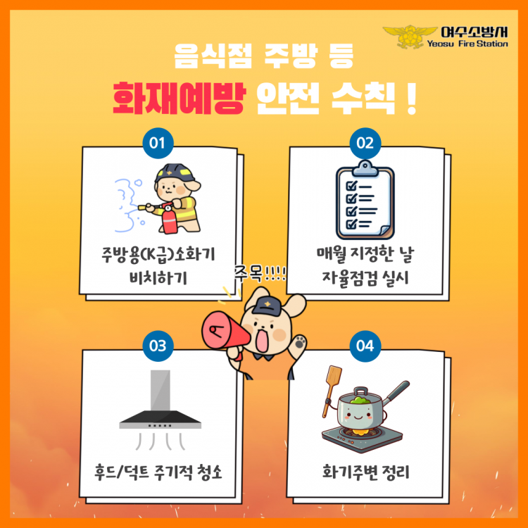 ÀÌ¿¡ ¿©¼ö¼Ò¹æ¼´Â À½½ÄÁ¡ ÁÖ¹æ ÈÀç ¿¹¹æÀ» À§ÇØ ´ÙÀ½°ú °°Àº ÇÙ½É ¾ÈÀü¼öÄ¢À» °Á¶Çß´Ù.