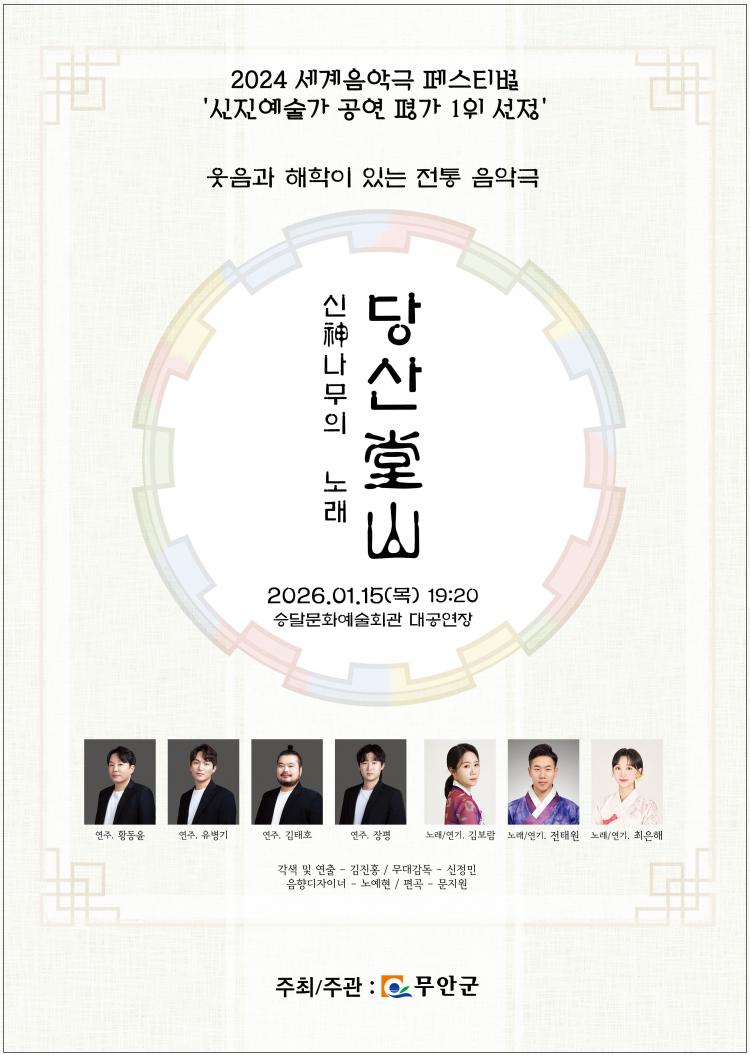 ¹«¾È±º(±º¼ö ±è»ê)Àº ¼¼°èÀ½¾Ç±ØÆä½ºÆ¼¹ú¿¡¼ ½ÅÁø¿¹¼ú°¡ ºÎ¹® 1À§·Î ¼±Á¤µÈ ÀüÅëÀ½¾Ç±Ø ¡®´ç»ê¡¯À» ¿À´Â 1¿ù 15ÀÏ ¿ÀÈÄ 7½Ã 20ºÐ, ½Â´Þ¹®È¿¹¼úȸ°ü ´ë°ø¿¬Àå¿¡¼ ¼±º¸ÀÎ´Ù°í ¹àÇû´Ù.