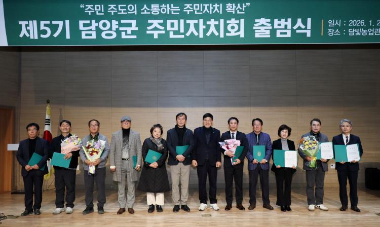Á¦5±â ´ã¾ç±º ÁÖ¹ÎÀÚġȸ´Â ¡®´ã¾ç±º ÁÖ¹ÎÀÚÄ¡ Ȱ¼ºÈ Á¶·Ê¡¯¿¡ µû¶ó °ø°³¸ðÁýÀ¸·Î ¼±¹ßµÈ 12°³ À¾¸é 268¸íÀ¸·Î ±¸¼ºµÆ´Ù. ÀÓ±â´Â 2³âÀ̸ç 2027³â 12¿ù ¸»±îÁö´Ù.