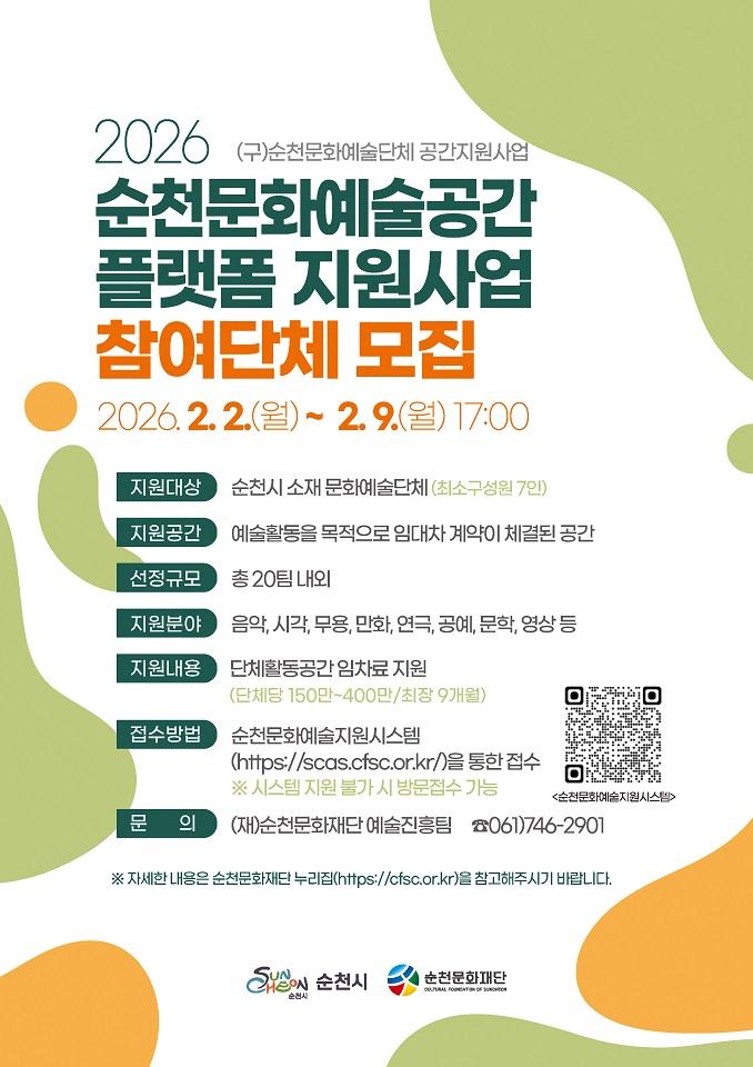 Àç´Ü¹ýÀÎ ¼øÃµ¹®ÈÀç´ÜÀÌ ¿À´Â 2ÀϺÎÅÍ ¿À´Â 9ÀϱîÁö ¡®2026 ¼øÃµ¹®È¿¹¼ú°ø°£ Ç÷§Æû Áö¿ø»ç¾÷¡¯¿¡ Âü¿©ÇÒ ¹®È¿¹¼ú´Üü¸¦ ¸ðÁýÇÑ´Ù. Áö¿ª ¹®È¿¹¼ú´ÜüÀÇ ¾ÈÁ¤ÀûÀΠȰµ¿ ±â¹ÝÀ» ¸¶·ÃÇϰí, ¹®È¿¹¼ú °ø°£À» Áö¿ª ¹®È¿¹¼ú »ýŰèÀÇ °ÅÁ¡À¸·Î Ű¿ì±â À§ÇÑ ÃëÁö´Ù.