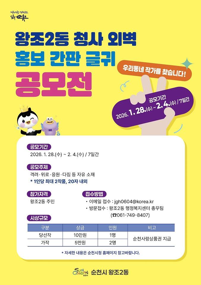 Àü¶ó³²µµ ¼øÃµ½Ã ¿ÕÁ¶2µ¿ ÇàÁ¤º¹Áö¼¾ÅͰ¡ µ¿¹ÎÀ» ´ë»óÀ¸·Î û»ç ¿Üº® È«º¸ °£ÆÇ¿¡ °Ô½ÃÇÒ ÀÀ¿ø ¹®±¸ °ø¸ðÀüÀ» ¿¬´Ù.
