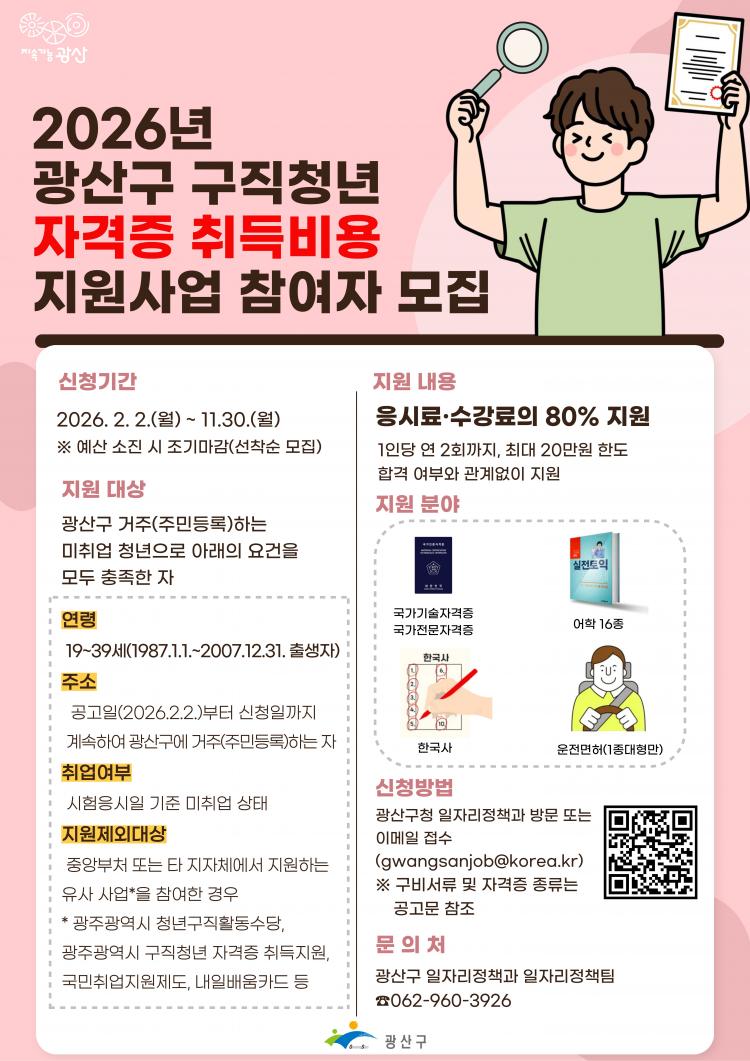 ±¤»ê±¸´Â ÀÌ´ÞºÎÅÍ °í¹°°¡¿Í Ãë¾÷³À¸·Î ¾î·Á¿òÀ» °Þ´Â û³âÀÇ Ãë¾÷ ¿ª·®À» ³ôÀÌ°í ±¸Á÷ ºñ¿ë ºÎ´ãÀ» ´ú±â À§ÇØ ¡®2026³â ±¸Á÷ û³â ÀÚ°ÝÁõ Ãëµæºñ¿ë Áö¿ø»ç¾÷¡¯À» ÃßÁøÇÑ´Ù.