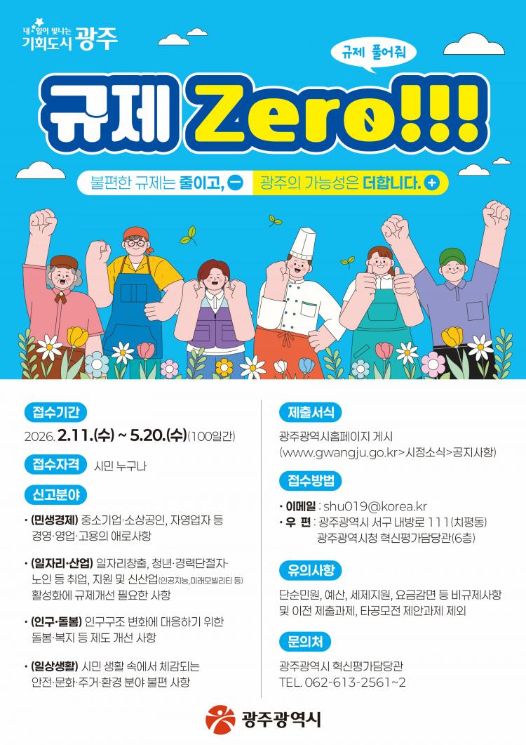 ±¤ÁÖ±¤¿ª½Ã°¡ ÀΰøÁö´É(AI)¡¤¹Ì·¡ ¸ðºô¸®Æ¼¡¤¿¡³ÊÁö µî Àü·«»ê¾÷ ºÐ¾ßÀÇ Á¦µµ °³¼± °úÁ¦¸¦ Áß½ÉÀ¸·Î, ½Ã¹Î »ýȰ ¼Ó ºÒÆíÀ» ÁÙÀ̱â À§ÇÑ »ýȰ¹ÐÂøÇü ±ÔÁ¦ ¹ß±¼¿¡ ³ª¼±´Ù. ¡®ºÒÇÕ¸®ÇÑ ±ÔÁ¦ ÁýÁ߹߱¼, ±ÔÁ¦ Á¦·Î¡¯¸¦ ¸ñÇ¥·Î ¿À´Â 11ÀϺÎÅÍ 5¿ù 20ÀϱîÁö 100Àϰ£ ÁýÁß ¹ß±¼ ±â°£À» ¿î¿µÇÑ´Ù.