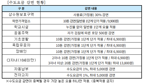 »ç¿ëÀÚÀÇ Ã¥ÀÓÀÌ ¾ø´Â ÁöÇÏ ¶Ç´Â º®Ã¼ ³» ´©¼ö°¡ ¹ß»ýÇßÀ» ¶§µµ ¿ä±ÝÀ» °¨¸é¹ÞÀ» ¼ö ÀÖ´Ù. ¹ß»ý ÀÌÀü 5°³¿ù µ¿¾ÈÀÇ Æò±Õ »ç¿ë·®À» ÃʰúÇÑ ¾ç¿¡ ´ëÇØ ÇýÅÃÀ» ÁØ´Ù. ´©¼ö È®ÀÎÀϺÎÅÍ 2°³¿ù ¾È¿¡ °ø»ç ÀüÈÄ »çÁø°ú ¿µ¼öÁõÀ» °®Ãç »óÇϼöµµ»ç¾÷¼Ò¿¡ ½ÅûÇÏ¸é µÈ´Ù.