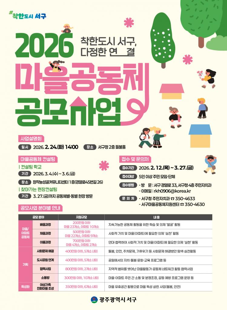 ±¤ÁÖ ¼±¸´Â µû¶æÇÑ ¸¶À» »ýŰ踦 Á¶¼ºÇϱâ À§ÇØ 3¾ï6000¸¸ ¿ø ±Ô¸ðÀÇ ¡®2026³â ÁÖ¹ÎÁÖµµ ¸¶À»°øµ¿Ã¼ °ø¸ð»ç¾÷¡¯À» ÃßÁøÇÑ´Ù.