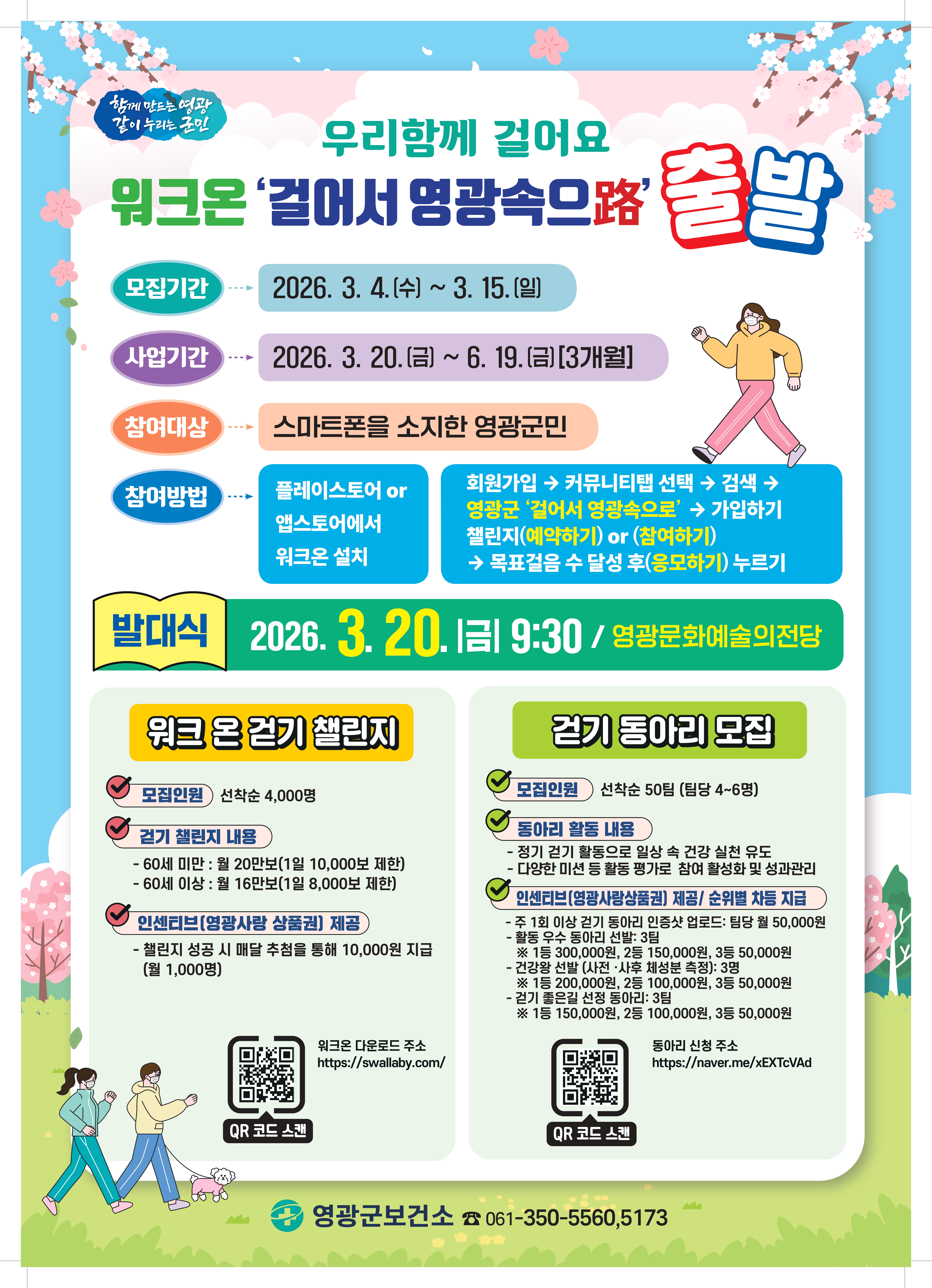¿µ±¤±ºÀº ±º¹Î ½ÅüȰµ¿À» Àå·ÁÇÏ°í ºñ¸¸À» ¿¹¹æÇϱâ À§ÇØ ¸ð¹ÙÀÏ °È±â ¾Û ¡®¿öÅ©¿Â(WalkOn)¡¯ÀÇ Ä¿¹Â´ÏƼ ¡®°É¾î¼ ¿µ±¤¼ÓÀ¸·Î¡¯ Âü°¡ÀÚ¿Í °È±â µ¿¾Æ¸®¸¦ ´ÙÀ½´Þ 4ÀϺÎÅÍ 15ÀϱîÁö ¸ðÁýÇÑ´Ù.