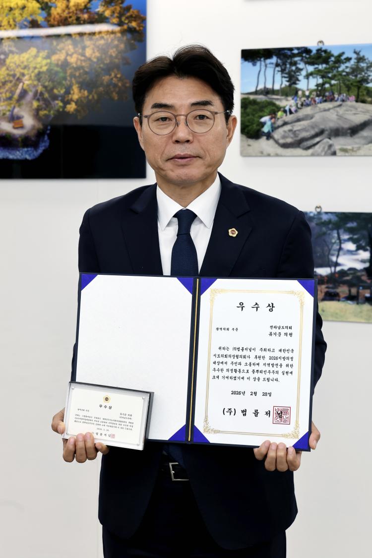 ´õºÒ¾î¹ÎÁÖ´ç ·ù±âÁØ Àü³²µµÀÇ¿ø(ȼø2)ÀÌ Áö³´Þ 28ÀÏ ¼¿ï DMC÷´Ü»ê¾÷¼¾ÅÍ¿¡¼ ¿¸° ¡®2026 Áö¹æÀÇÁ¤´ë»ó¡¯ ½Ã»ó½Ä¿¡¼ ±¤¿ªÀÇ¿ø ºÎ¹® ¿ì¼ö»óÀ» ¹Þ¾Ò´Ù.