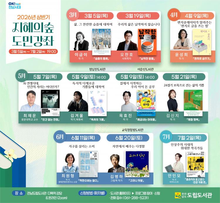 ÁöÇýÀÇ ½£ µµ¹Î°Á´ 2013³â ½ÃÀÛÇØ Áö±Ý±îÁö 259Â÷·Ê ¿î¿µµÆ°í 4¸¸¿© ¸íÀÌ Âü¿©ÇÑ Àü³²µµ¸³µµ¼°ü ´ëÇ¥ Àι®ÇÐ ÇÁ·Î±×·¥ÀÌ´Ù. Àü³²µµ¸³µµ¼°üÀº ¿ÃÇØ »ó¹Ý±â¿¡ Çѱ¹ ±ÙÇö´ë»ç¿Í ±Û¾²±â, ÀΰøÁö´É, °æÁ¦, ȯ°æ, ¿¹¼ú µî ºÐ¾ßº° Àü¹®°¡¸¦ ÃÊÃ»ÇØ 10°³ °Á¸¦ ÁøÇàÇÑ´Ù.