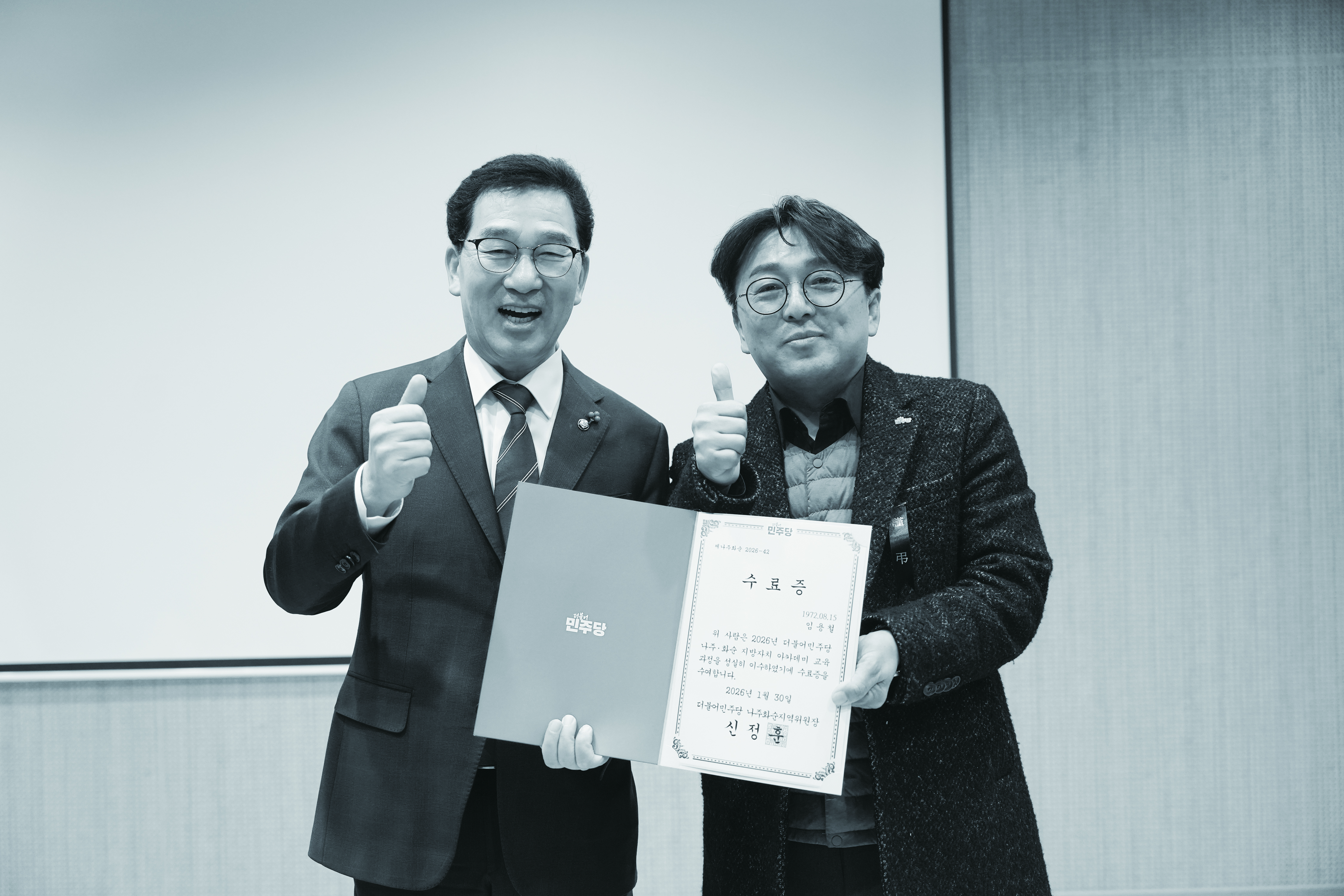 | ÀÓ¿ëö ¿¹ºñÈĺ¸(¿À¸¥ÂÊ)°¡ ½ÅÁ¤ÈÆ ¹ÎÁÖ´ç ³ªÁÖ¡¤È¼ø Áö¿ªÀ§¿øÀåÀ¸·ÎºÎÅÍ Áö¹æÀÚÄ¡ ¾ÆÄ«µ¥¹Ì ¼ö·áÁõÀ» ¹Þ°í ±â³ä »çÁøÀ» Âï°íÀÖ´Ù. |