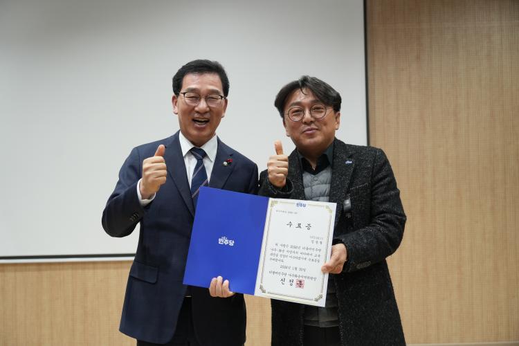 | ÀÓ¿ëö ¿¹ºñÈĺ¸(¿À¸¥ÂÊ)°¡ ½ÅÁ¤ÈÆ ¹ÎÁÖ´ç ³ªÁÖ¡¤È¼ø Áö¿ªÀ§¿øÀåÀ¸·ÎºÎÅÍ Áö¹æÀÚÄ¡ ¾ÆÄ«µ¥¹Ì ¼ö·áÁõÀ» ¹Þ°í ±â³ä »çÁøÀ» Âï°íÀÖ´Ù. |