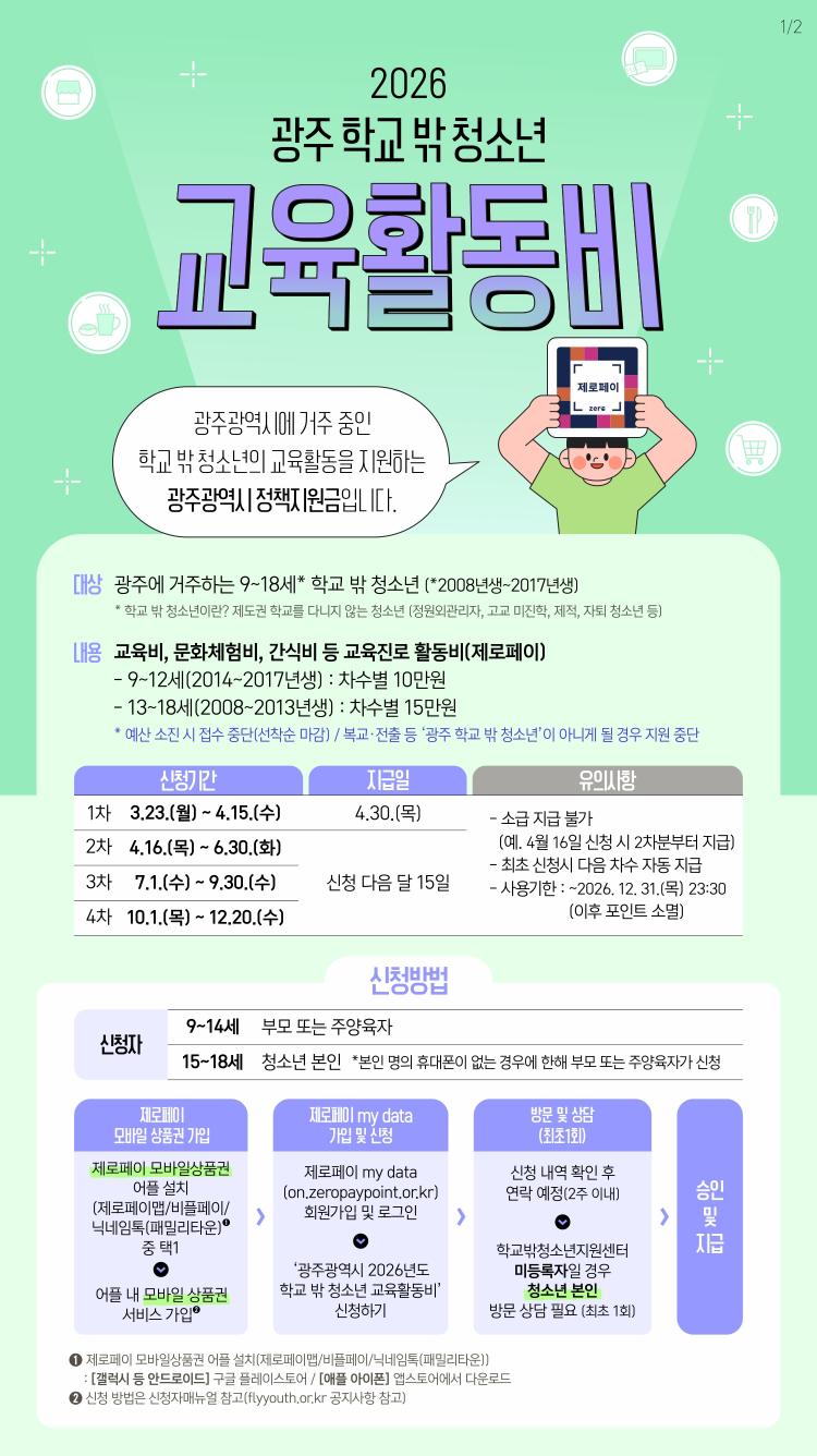 ±¤ÁÖ±¤¿ª½Ã´Â Çб³ ¹Û û¼Ò³âÀÇ ±³À° ±âȸ¸¦ ³ÐÈ÷°í ¾ÈÁ¤ÀûÀÎ ¼ºÀåÀ» µÞ¹ÞħÇϱâ À§ÇØ ¡®Çб³ ¹Û û¼Ò³â ±³À°È°µ¿ºñ Áö¿ø»ç¾÷¡¯À» ¿î¿µÇÏ°í ¿À´Â 23ÀϺÎÅÍ ½ÅûÀ» ¹Þ´Â´Ù°í ¹àÇû´Ù.