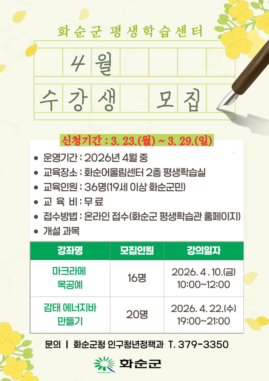 ȼø±ºÀº Áö¿ª ÁÖ¹ÎÀÇ Æò»ýÇнÀ Âü¿© È®´ë¿Í ÇнÀ Á¢±Ù¼º Çâ»óÀ» À§ÇØ 4¿ù ¿î¿µÇÏ´Â Æò»ýÇнÀ ÇÁ·Î±×·¥ Âü¿©ÀÚ¸¦ ¸ðÁýÇÑ´Ù°í ¿À´Ã ¹àÇû´Ù.