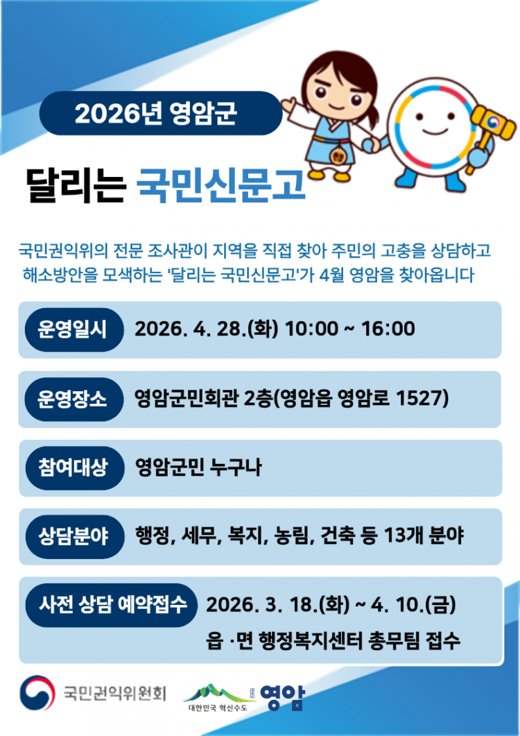 ÇöÀå¿¡´Â ±¹¹Î±ÇÀÍÀ§¿øÈ¸ Àü¹® Á¶»ç°üÀÌ Âü¿©ÇØ ÇàÁ¤°ú º¹Áö, »ýȰ¹ý·ü, ¼¹Î±ÝÀ¶, ¼ÒºñÀÚ ÇÇÇØ±¸Á¦ µî ´Ù¾çÇÑ ºÐ¾ß ¹Î¿øÀ» »ó´ãÇÑ´Ù. ¿µ¾Ï±ºÀº ÀÏ»ó»ýȰ°ú ¹ÐÁ¢ÇÑ ¹Î¿øÀ» Áß½ÉÀ¸·Î »ó´ã ¹üÀ§¸¦ ³ÐÇô ±º¹Î ºÒÆíÀ» ÁÙÀÌ°í ½ÇÁúÀûÀÎ ÇØ°áÀ» Áö¿øÇÒ °èȹÀÌ´Ù.