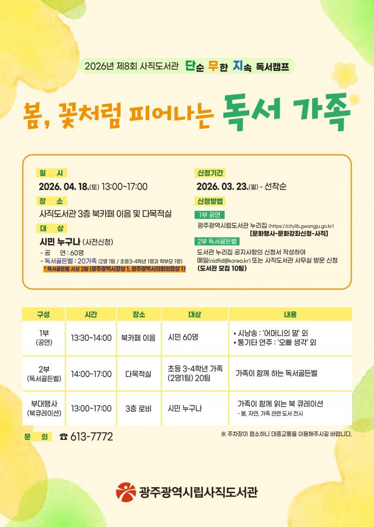 À̹ø Çà»ç´Â ¡®º½, ²Éó·³ ÇǾ´Â µ¶¼ °¡Á·¡¯À» ÁÖÁ¦·Î ¸¶·ÃµÆ´Ù. °¡Á·ÀÌ Ã¥À» ÅëÇØ ¼·Î ¼ÒÅëÇÏ¸ç µ¶¼ÀÇ Áñ°Å¿òÀ» ³ª´©°í, µµ¼°ü Áß½ÉÀÇ °¡Á· µ¶¼¹®È¸¦ ³ÐÈ÷±â À§ÇÑ ÃëÁö´Ù.