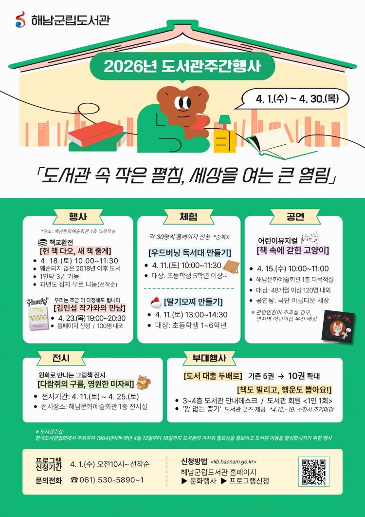 ¾î¸°ÀÌ¿Í Ã»¼Ò³âÀ» À§ÇÑ ÇÁ·Î±×·¥µµ ÁغñµÆ´Ù. ¿À´Â 15ÀÏ ¿ÀÀü 10½Ã¿¡´Â ¹ÂÁöÄà ¡®Ã¥ ¼Ó¿¡ °¤Èù °í¾çÀÌ¡¯ °ø¿¬ÀÌ ÁøÇàµÈ´Ù. ¿À´Â 11ÀÏ¿¡´Â ÃʵîÇб³ 5Çгâ ÀÌ»óÀÌ Âü¿©ÇÒ ¼ö ÀÖ´Â ¿ìµå¹ö´× µ¶¼´ë ¸¸µé±â¿Í µþ±â¸ðÂî ¸¸µé±â üÇèÀÌ ¿¸°´Ù.
