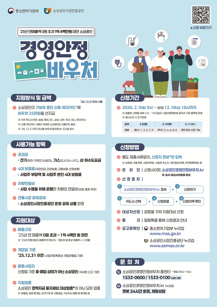 Áö¿ø ´ë»óÀº 2025³â ±âÁØ ¿¬ ¸ÅÃâ¾× 1¾ï 400¸¸ ¿ø ¹Ì¸¸ ¼Ò»ó°øÀÎÀÌ´Ù. ½ÅûÀÏ ±âÁØ Á¤»ó ¿µ¾÷ ÁßÀÎ »ç¾÷ÀÚ¶ó¸é ´ëºÎºÐ ½ÅûÇÒ ¼ö ÀÖ´Ù. ÀϺΠ¾÷Á¾Àº Á¦ÇѵÇÁö¸¸ ÀϹÝÀûÀÎ ÀÚ¿µ¾÷ÀÚ´Â Æø³Ð°Ô Æ÷ÇԵŠÁ¤Ã¥ ü°¨µµ¸¦ ³ô¿´´Ù.