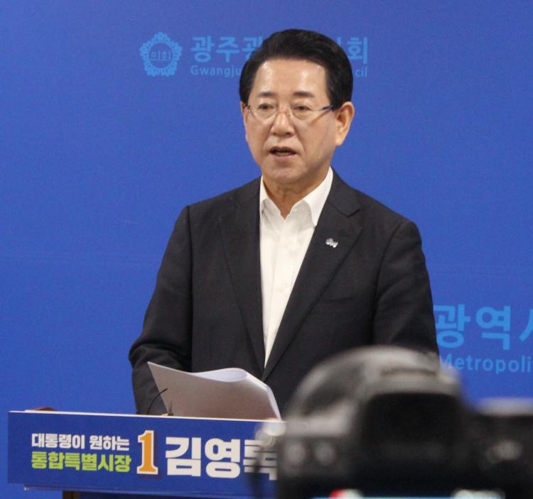 ±è¿µ·Ï Àü³²±¤ÁÖÆ¯º°½ÃÀå ¿¹ºñÈ帰¡ 6ÀÏ ±¤ÁÖ½ÃÀÇȸ ºê¸®Çη뿡¼ ±âÀÚȸ°ßÀ» ¿°í °á¼± ÁøÃâ ÀÔÀåÀ» ¹àÈ÷°í ÀÖ´Ù. [»çÁø=±è¿µ·Ï Èĺ¸ Ãø]