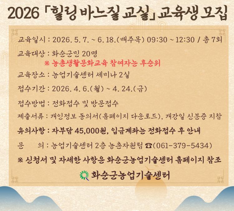 ȼø±ºÀº Áö³ 6ÀÏ ½Ç»ýȰ¿¡ Ȱ¿ëÇÒ ¼ö ÀÖ´Â ÀüÅë »ýȰ±â¼ú º¸±ÞÀ» ÅëÇØ »õ·Î¿î ºÎ°¡°¡Ä¡¸¦ âÃâÇϰíÀÚ À̹ø ±³À°À» ¸¶·ÃÇß´Ù°í ¹àÇû´Ù. ±³À°Àº ´ÙÀ½´Þ 7ÀϺÎÅÍ 6¿ù 18ÀϱîÁö ³ó¾÷±â¼ú¼¾ÅÍ¿¡¼ ¸ÅÁÖ ¸ñ¿äÀÏ ¸ðµÎ 7Â÷·Ê ÁøÇàµÇ¸ç ȼø±º¹Î 20¸íÀ» ¸ðÁýÇÑ´Ù.