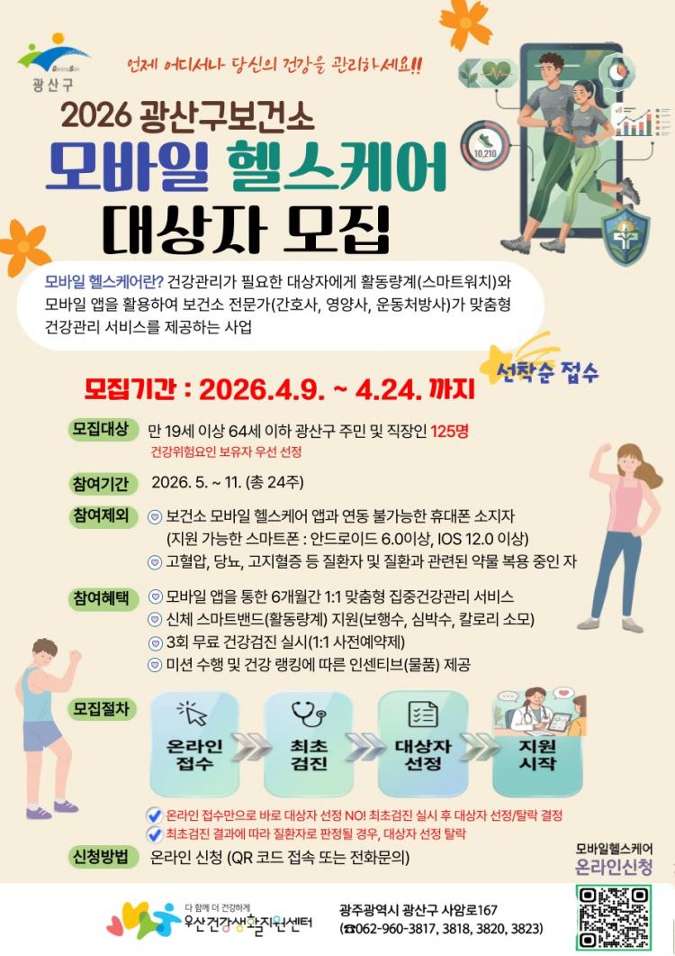 ±¤ÁÖ ±¤»ê±¸°¡ Á¤º¸Åë½Å±â¼ú(ICT)À» Ȱ¿ëÇÑ ¡®2026³â ¸ð¹ÙÀÏ ÇコÄɾ »ç¾÷À» º»°Ý ¿î¿µÇÑ´Ù. ½Ã°£°ú Àå¼Ò Á¦¾àÀ» ÁÙÀÎ ºñ´ë¸é °Ç°­°ü¸® ¼­ºñ½º·Î ÁֹεéÀÇ »ýȰ ¼Ó °Ç°­°ü¸®¸¦ µ½°Ú´Ù´Â ÃëÁö´Ù.