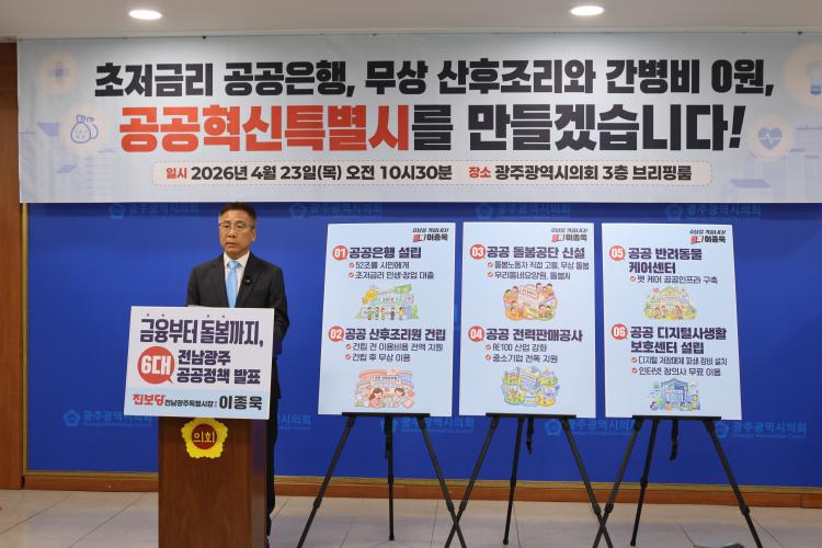Áøº¸´ç Àü³²±¤ÁÖÆ¯º°½ÃÀå ÀÌÁ¾¿í Èĺ¸(¹ÎÁÖ³ëÃÑ ±¤ÁÖº»ºÎÀå)´Â ¿À´Ã ±âÀÚȸ°ßÀ» ¿°í Àü³²±¤ÁÖÆ¯º°½Ã¸¦ ¡®°ø°øÇõ½ÅƯº°½Ã¡¯·Î ¸¸µé±â À§ÇÑ 6´ë ÇÙ½É °ø°ø Á¤Ã¥À» ¹ßÇ¥Çß´Ù. ÀÌ È帴 ÃÊÀú±Ý¸® °ø°øÀºÇà ¼³¸³°ú »êÈÄÁ¶¸® ºñ¿ë Áö¿ø, °ø°ø µ¹º½ ¼ºñ½º °È µîÀ» ÅëÇØ Áö¿ª ÁֹεéÀÇ »îÀÇ ÁúÀ» °³¼±ÇÏ°Ú´Ù°í °Á¶Çß´Ù.
