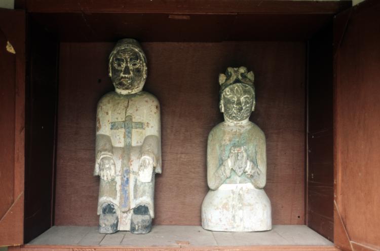¿Á°ú¼ºÈ²´ç¸ñÁ¶½Å»óÀº ¾à 500³â Àü¿¡ ¸¸µé¾îÁø °ÍÀ¸·Î ÀüÇØÁø´Ù. Çѱ¹¹ÎÁ·¹®È´ë¹é°ú´Â ³²½Å»ó ³ôÀ̸¦ 84§¯, ¿©½Å»ó ³ôÀ̸¦ 68§¯·Î ±â·ÏÇϰí, ³²½Å»óÀº ¹«´çµéÀÌ ¾²´Â ¸ðÀÚ¿Í ´àÀº °ü¸ð¸¦ ¾²°í ÀÖÀ¸¸ç Å« ´«½ç°ú Æ¢¾î³ª¿Â ´« ¶§¹®¿¡ Àå½Â°úµµ ÅëÇÑ´Ù°í ¼³¸íÇÑ´Ù. Ç㸮¿¡´Â Èä´ë¸¦ µÎ¸£°í, Áß¾Ó¿¡¼ ¹ÀÎ ¶ì°¡ ¹ßµî±îÁö ³»·Á¿Â´Ù. ¿©½Å»óÀº °í±ò °°Àº °ÍÀ» ¾²°í, ¾ó±¼ Ç¥ÇöÀÌ ³²½Å»óº¸´Ù Á¤±³Çϸç, ¸ð¾Æ Áå µÎ ¼ÕÀº ¹«¾ùÀΰ¡¸¦ µé°í ±â¿øÇÏ´Â ¸ð½ÀÀ¸·Î Á¤¸®µÅ ÀÖ´Ù. ±¹°¡À¯»êÆ÷ÅÐÀº ¿Á°ú ¼ºÈ²´ç ¾È¿¡ º¸Á¸µÈ ³²³à ÇÑ ½ÖÀÇ ¸ñ»óÀÌ ¹Î°£½Å¾Ó¿¡¼ ½ÅÀ¸·Î ¿©±â´ø ´ë»ó¹°À̶ó°í ¼³¸íÇÑ´Ù. ³²ÀÚ»óÀº Á¶Åë À屺À¸·Î ÀüÇϰí, ¿©ÀÚ»óÀº À屺ÀÇ Ã³¶ó´Â ¼³°ú À屺À» »ç¸ðÇÏ´Ù ÇÑÀ» ǰ°í Á×Àº °øÁÖ¶ó´Â ¼³ÀÌ ÇÔ²² ÀüÇÏÁö¸¸ È®½ÇÇÏÁö´Â ¾Ê´Ù°í Á¤¸®ÇÑ´Ù. ÀÌ ´ë¸ñÀº ¿Á°ú ¼ºÈ²´ç Àü½ÂÀ» ÀÐÀ» ¶§ Áß¿äÇÑ ±âÁØÀÌ µÈ´Ù. Á¶Åë°ú °øÁÖÀÇ ¼³È´Â Áö¿ª¿¡¼ ¿À·¡ ÀüÇØÁø À̾߱âÁö¸¸, ¿©½Å»óÀÇ Á¤Ã¼´Â ¿©·¯ °¥·¡ÀÇ Àü½ÂÀ» ǰ°í ÀÖ´Ù. µÎ ¸ñÁ¶½Å»óÀº ±×·¡¼ ´õ Èï¹Ì·Ó´Ù. ³²½Å»óÀÇ Àå½ÂÀû ÀλóÀº ¸¶À» ¹ÛÀÇ »ç¾ÇÇÔÀ» ¸·´Â ¼öÈ£½ÅÀÇ À̹ÌÁö¸¦ ¶°¿Ã¸®°Ô ÇÑ´Ù. ¿©½Å»óÀÇ ±â¿øÇÏ´Â µÎ ¼ÕÀº ´Ü¼øÇÑ Àå½ÄÀÌ ¾Æ´Ï¶ó, ´Þ·¥°ú ºõÀÇ ¸öÁþÀ¸·Î ÀÐÈù´Ù. ÇÑ »ç¶÷Àº °íÀ»ÀÇ °æ°è¸¦ ÁöŰ´Â ÈûÀ¸·Î, ´Ù¸¥ ÇÑ »ç¶÷Àº Ç®¸®Áö ¾ÊÀº ¸¶À½À» Çϴÿ¡ ¿Ã¸®´Â ±âµµÀÚ·Î ÀÚ¸®ÇÑ´Ù. ¹Î°£½Å¾Ó Á¶°¢Àº ±ÃÁ߹̼úó·³ ¿Ï¼ºµÈ ±ÕÇüÀ» °Ü·çÁö ¾Ê´Â´Ù. ¿ÀÈ÷·Á Åõ¹ÚÇÔ ¼Ó¿¡¼ »ý»ýÇÏ´Ù. ¿Á°úÀÇ µÎ ¸ñÁ¶½Å»óÀº ½Å¾ÓÀÇ ´ë»óÀÌÀÚ À̾߱âÀÇ ¸Å°³Ã¼´Ù. ´©±º°¡¿¡°Ô´Â Á¶Åë°ú ¾Æ¿Õ°øÁÖÀÇ ¸ð½ÀÀ̰í, ´©±º°¡¿¡°Ô´Â ¼ºÈ²½ÅÀÇ ½Åü´Ù. ¶Ç ´©±º°¡¿¡°Ô´Â ¿¾ ¿Á°úÇöÀÇ ÇàÁ¤°ú Á¦Àǰ¡ ³²±ä ÈçÀûÀÌ´Ù. ÇϳªÀÇ ¸ñ»óÀÌ ¿©·¯ Àǹ̸¦ ǰÀ» ¼ö ÀÖ´Ù´Â Á¡¿¡¼ ÀÌ À¯»êÀº ¹®È¸é ±âȹ±â»çÀÇ ÁÁÀº ¼ÒÀç°¡ µÈ´Ù. ¸ñÁ¶½Å»ó ¾Æ·¡¿¡ ³õÀÎ ½Ã°£µµ ¸¸¸¸Ä¡ ¾Ê´Ù. ³ª¹«´Â µ¹º¸´Ù ¾àÇϰí, ºÒº¸´Ù ¾àÇϰí, ½À±â¿Í ¹ú·¹¿¡µµ ¾àÇÏ´Ù. ±×·³¿¡µµ ÀÌ ¸ñ»óÀº ¿À·¡ ³²¾Ò´Ù. ¿À·¡ ³²¾Ò´Ù´Â °ÍÀº ´ÜÁö º¸Á¸ÀÌ Àߵƴٴ ¶æ¸¸Àº ¾Æ´Ï´Ù. ´©±º°¡°¡ ÁöÄѺðí, ´©±º°¡°¡ ¿Å°å°í, ´©±º°¡°¡ ÀØÁö ¾Ê¾Ò´Ù´Â ¶æÀÌ´Ù. ¿Á°ú ¼ºÈ²´çÀÇ ¸ñÁ¶½Å»óÀº Á¶°¢Ç°À̱â Àü¿¡ ±â¾ïÀÇ ¹°°ÇÀÌ´Ù. ¼ÕÀ¸·Î ±ðÀº ³ª¹«°¡ ¸¶À»ÀÇ µÎ·Á¿ò°ú ¿¬¹Î, Àںνɰú ±â¿øÀ» ÇÔ²² ¹Þ¾Æ³½ ¼ÀÀÌ´Ù.