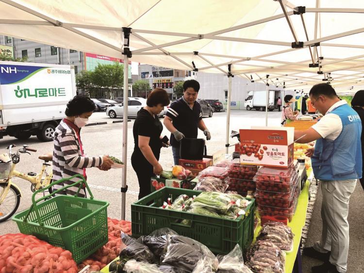 Äڷγª19ÀÇ ¿©ÆÄ·Î ±¤ÁÖ±¤¿ª½Ã 14°³ ³óÇùÀÌ Âü¿©ÇÏ¿© Áö¿ªÀÇ ³ó»ê¹°À» ¼ÒºñÀÚ°¡ °¡±î¿î °÷¿¡¼ ±¸ÀÔÇÒ ¼ö ÀÖµµ·Ï ¸ÅÁÖ ±Ý¿äÀÏ ¼ö¿Ïµ¿ Áֹμ¾ÅÍ¿¡¼ ¿·È´ø ¡®±Ý¿äÁ÷°Å·¡ÀåÅÍ¡¯ ¶ÇÇÑ ¿ÃÇØ ½±»ç¸® °³ÃÖµÇÁö ¸øÇϰí ÀÖ¾ú´Ù. ÀÛ³â 5¿ù, °³ÃÖ ¿¹Á¤ µÆ¾ú´ø ¡®±Ý¿äÁ÷°Å·¡ÀåÅÍ¡¯´Â Á¤ºÎÀÇ Àç³Áö¿ø±Ý ½Åû µîÀ¸·Î Àå¼Ò°¡ ¿©ÀÇÄ¡ ¾Ê¾Æ ¿¸®Áö ¸øÇϰí ÀÖ´Â ½ÇÁ¤¿¡¼ 6¿ù 5ÀÏ(±Ý)ºÎÅÍ ¼ö¿Ïµ¿¿¡ ¼ÒÀçÇÑ ±¤ÁÖ ºñ¾Æ³óÇù ¿Á¿ÜÁÖÂ÷Àå¿¡¼ ±Ý¿äÁ÷°Å·¡ÀåÅ͸¦ Àӽà °³ÀåÇÏ¿´´Ù. Áö¿ªÀÇ ³ó°¡¿¡¼ »ý»êµÈ ³ó»ê¹°À» Áö¿ªÁֹε鿡°Ô Àú·ÅÇÑ °¡°Ý¿¡ °ø±ÞÇÏ¿© Å« È£ÀÀÀ» ¹Þ¾Ò´Ù. ÇöÀç´Â Äڷγª19ÀÇ Áö¿ª È®»ê¼¼°¡ Áö¼ÓµÇ°í ÀÖ¾î ±¤ÁÖ ºñ¾Æ³óÇù°ú ¼ö¿Ïµ¿ Áֹμ¾ÅÍ ¸ðµÎ Á÷°Å·¡ ÀåÅÍ´Â ÈÞÀåÇϰí ÀÖÀ¸³ª, Äڷγª19ÀÇ È®»ê¼¼°¡ ÁÙ¾îµé¸é ´Ù½Ã °³ÀåÇÒ ¿¹Á¤ÀÌ´Ù.